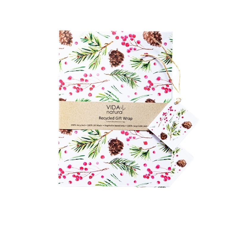 Our Christmas Cones and Berries Gift wrapping paper in a 2 pack with four gift tags.