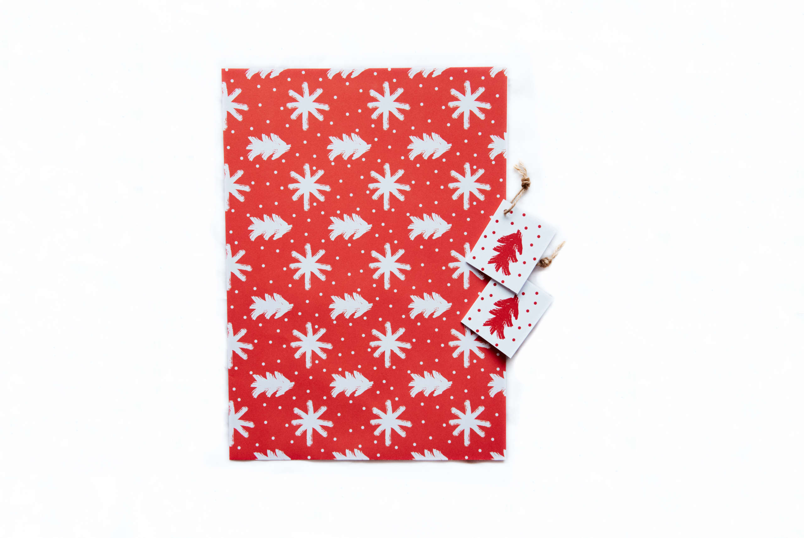Gift Wrap 2 Pack with 4 gift tags – Red Christmas trees and snowflakes