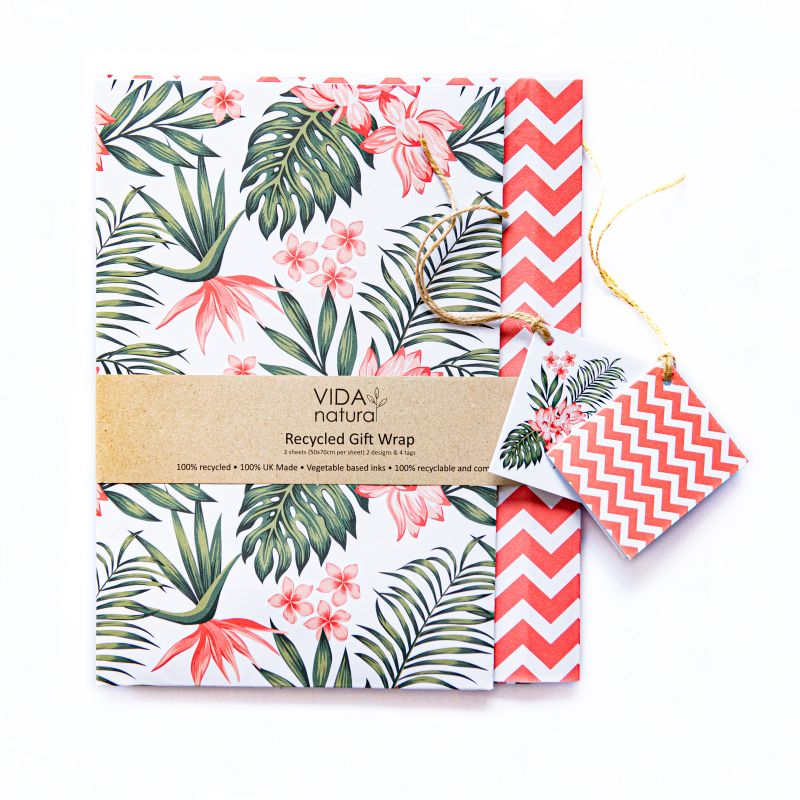 Gift Wrap 2 Pack with 4 gift tags – tropical flowers & zig zag