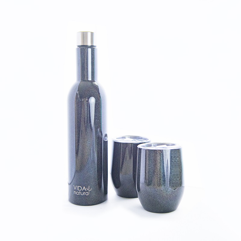Stainless Steel Wine Bottle & Tumblers Set – Black Glitter