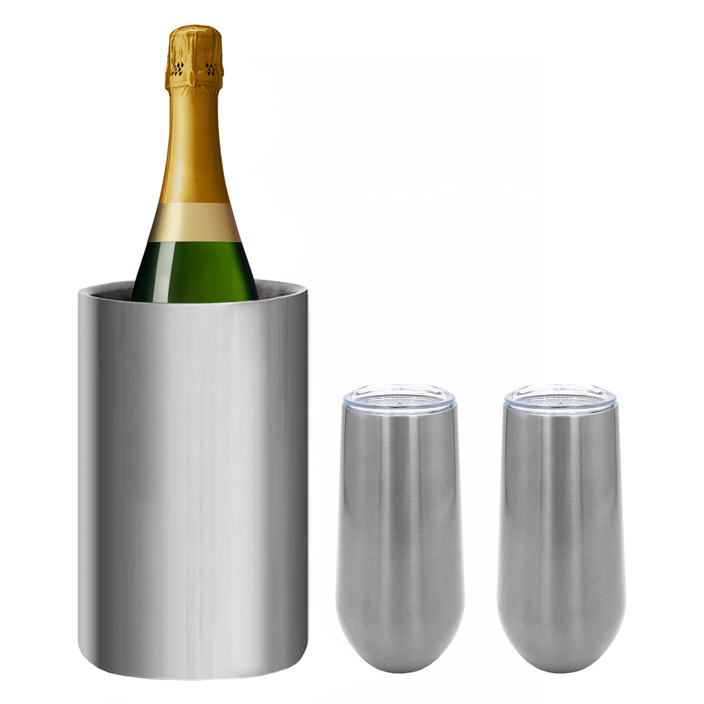 Choose from four wine cooler gift sets each containing a wine cooler and 2 x tumblers, or 2 flutes. They are available in a choice of Rose Gold or Silver. The Rose Gold versions also come with two free shot glasses. All are packed together into a gift box which are made from eco friendly materials.